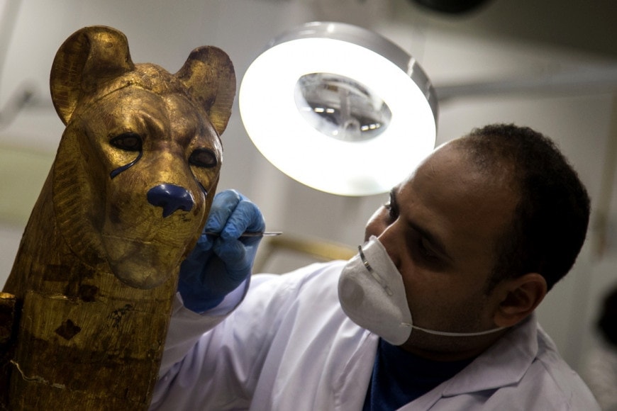 Αιγύπτιοι αρχαιολόγοι και συντηρητές, εργάζονται για την αποκατάσταση και άλλων χρυσοποίκιλτων γλυπτών που περιστοίχιζαν την σαρκοφάγο του Τουταγχαμών.