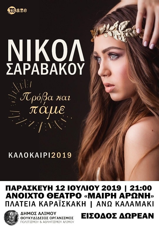 Γέννημα θρέμμα του Αλίμου η Νικόλ ξεκινάει τις καλοκαιρινές της συναυλίες από την πόλη μας, την Παρασκευή 12 Ιουλίου 2019 στις 9μμ, στο υπαίθριο θέατρο «Μαίρη Αρώνη».
