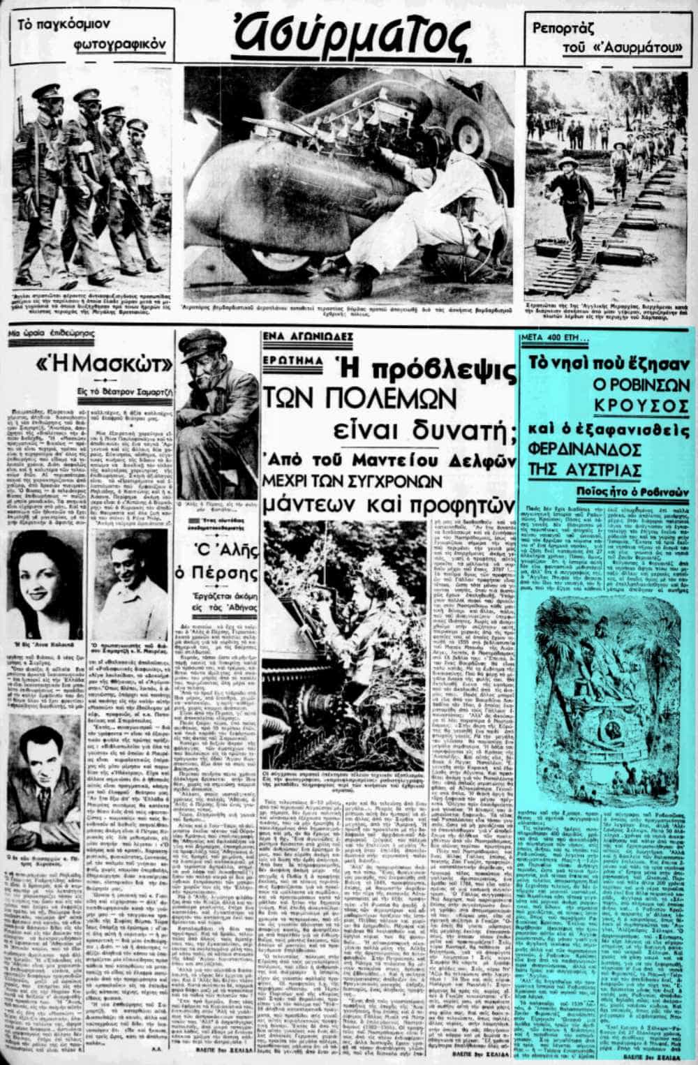 Η είδηση δημοσιεύθηκε στην εφημερίδα «ΑΣΥΡΜΑΤΟΣ», στις 25/08/1939…