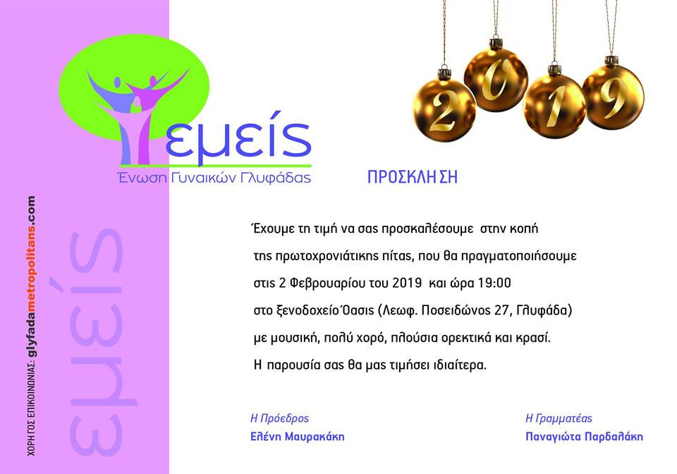 Οι Δήμοι μαςΓλυφάδαΗ Ένωση Γυναικών Γλυφάδας “Εμείς”, σάς προσκαλεί στην κοπή της πρωτοχρονιάτικης πίταςΑπό Oi Notioi - 31 Δεκεμβρίου 2018FacebookTwitterWhatsAppLinkedinEmailΤυπώνωTelegramViber Η Ένωση Γυναικών Γλυφάδας “Εμείς”, σάς προσκαλεί στην κοπή της πρωτοχρονιάτικης πίτας, που θα πραγματοποιήσει στις 2 Φεβρουαρίου 2019 και ώρα 19:00 στο ξενοδοχείο Όασις (Λεωφ. Ποσειδώνος 27, Γλυφάδα)