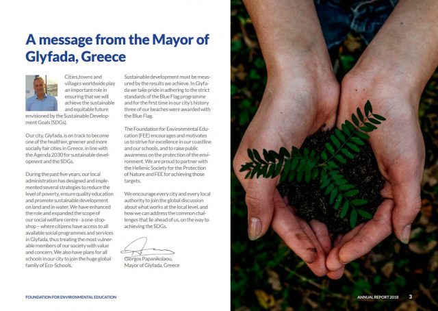 Κάθε χρόνο το Ίδρυμα για την Περιβαλλοντική Εκπαίδευση (FEE) δημοσιεύει την ετήσια έκθεσή του και παραχωρεί το κύριο άρθρο της σε Δήμαρχο ενός από τους Δήμους διεθνώς που βραβεύτηκε με γαλάζια σημαία.