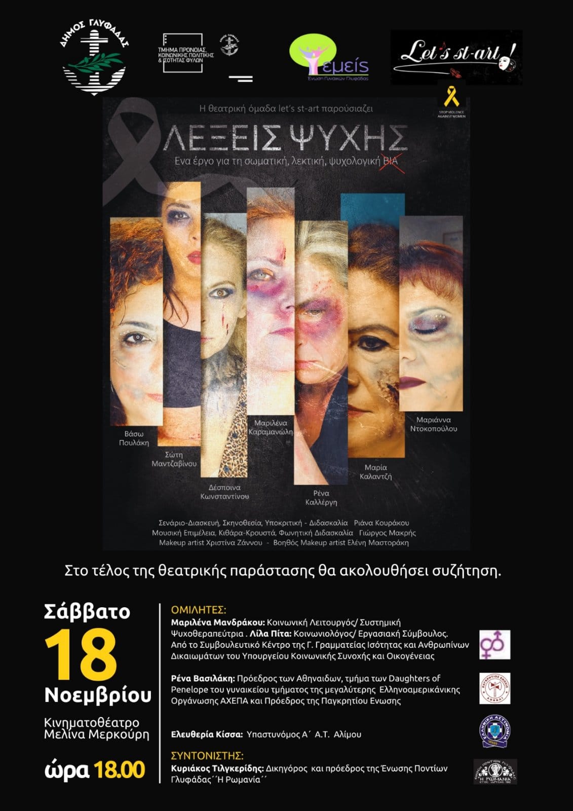 Μια πολύ σημαντική θεατρική παράσταση αφύπνισης και ευαισθητοποίησης, υπό τον τίτλο «Λέξεις Ψυχής» θα παρουσιάσει η θεατρική ομάδα Let’s st-art στο πλαίσιο εκδήλωσης που συνδιοργανώνουν η Κοινωνική Υπηρεσία του Δήμου Γλυφάδας και η Ένωση Γυναικών Γλυφάδας «Εμείς – Λένα Μαυρακάκη» με την Πρόεδρό της Χρύσα Λουπασάκη, στο Κινηματοθέατρο «Μελίνα Μερκούρη» (Γ. Γεννηματά και Ανατ. Ρωμυλίας 123) το Σάββατο 18 Νοεμβρίου, στις 6:00 το απόγευμα. Πρόκειται για ένα έργο ενάντια στη σωματική, λεκτική και ψυχολογική βία, σε μια εκδήλωση όπου θα διατρανωθεί η αντίθεση της κοινωνίας απέναντι στο νοσηρό αυτό φαινόμενο και η αλήθεια που επικρατεί στην πόλη μας: καμία γυναίκα δεν είναι μόνη σε αυτό, υπάρχει βοήθεια ουσιαστική, υπάρχει στήριξη και πρέπει να εξαλειφθεί ο φόβος, να πάψει η σιωπή.