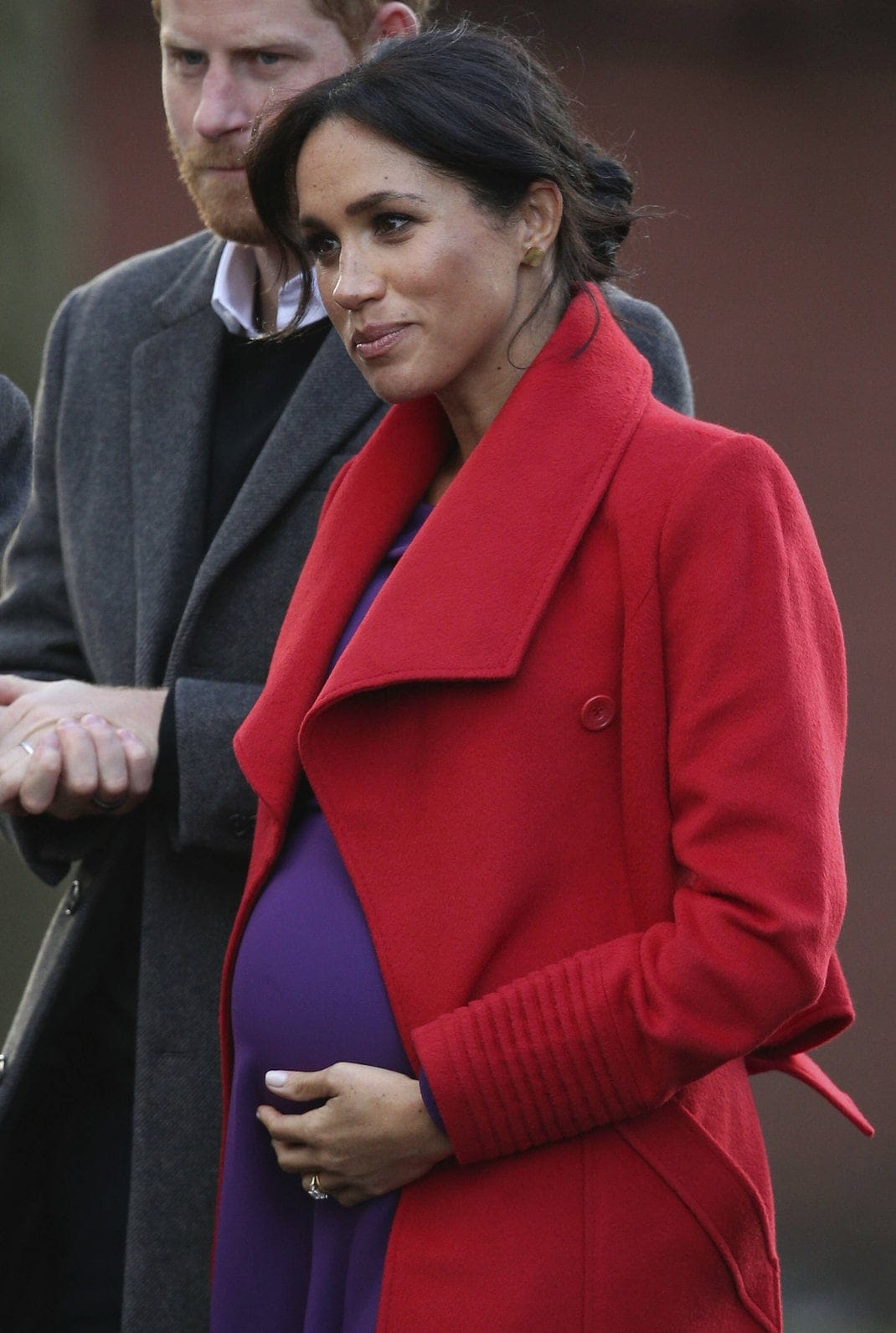 Η έγκυος Μέγκαν εμφανίστηκε με ανοιχτόχρωμα ρούχα και εντυπωσίασε με την 6 μηνών κοιλίτσα της να φαίνεται αρκετά. Επέλεξε ένα μωβ midi φόρεμα με σκίσιμο του brand ARITZIA και κόκκινο παλτό Sentaler που έδενε στη μέση.