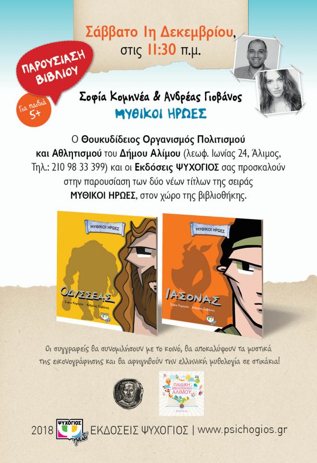 Ο Θουκυδίδειος Οργανισμός Πολιτισμού και Αθλητισμού του Δήμου Αλίμου και οι Εκδόσεις ΨΥΧΟΓΙΟΣ σας προσκαλούν στην παρουσίαση των δύο νέων τίτλων της σειράς ΜΥΘΙΚΟΙ ΗΡΩΕΣ, στον χώρο της βιβλιοθήκης, το Σάββατο 1η Δεκεμβρίου