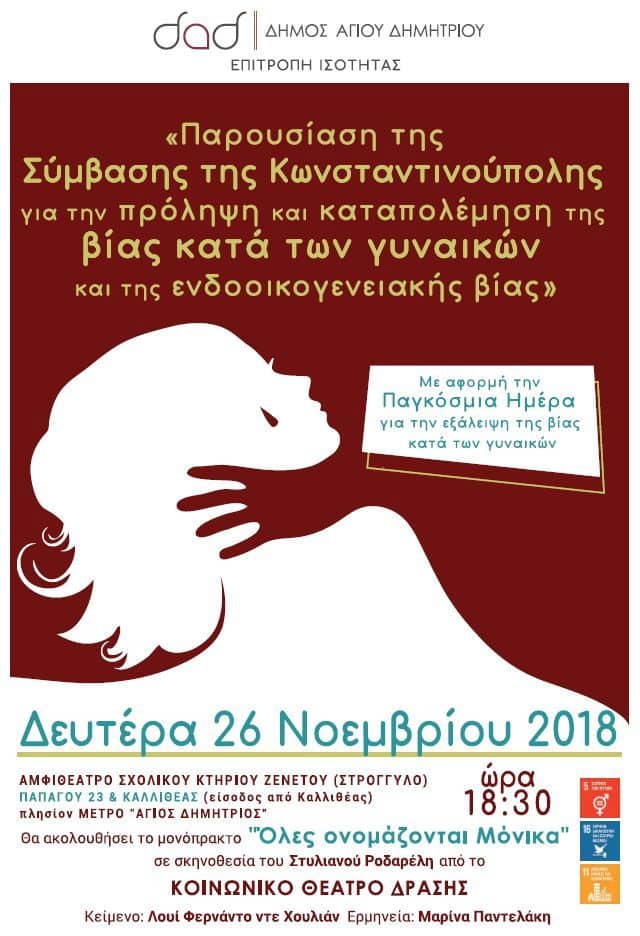 Με αφορμή την Παγκόσμια Ημέρα για την εξάλειψη της βίας κατά των γυναικών, η Επιτροπή Ισότητας του Δήμου Αγίου Δημητρίου διοργανώνει εκδήλωση με θέμα την