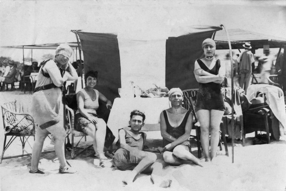 (Στην κεντρική φωτογραφία: Γλυφάδα, 1928. Άνδρες και γυναίκες κολυμπούν επιτέλους μαζί στα περίφημα bain mixte. – Αρχείο Νίκου Πολίτη)