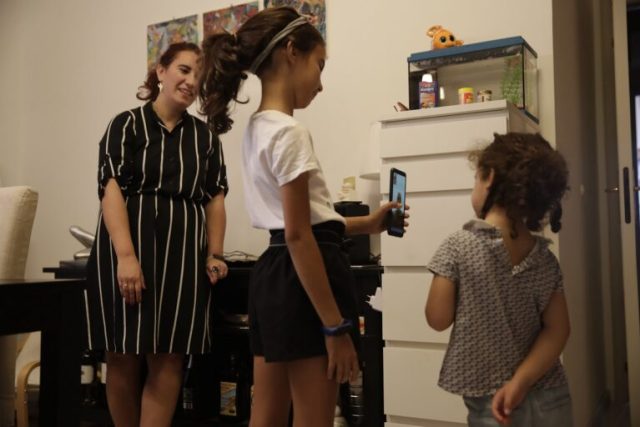 Ten-year-old Cecilia Rungi, center, her four-year-old sister Camilla and their mother Maria Cristina Baggi, get ready for the first day of school in Codogno, Italy, Monday, Sept. 14, 2020. The morning bell Monday marks the first entrance to the classroom for the children of Codogno since Feb. 21, when panicked parents were sent to pick up their children after the northern Italian town gained notoriety as the first in the West to record local transmission of the coronavirus. (AP Photo/Luca Bruno)