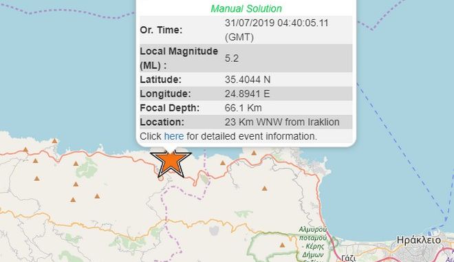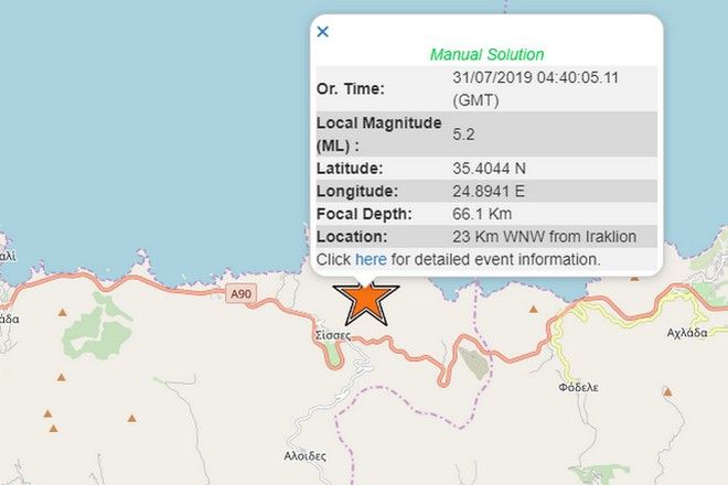 Ισχυρός σεισμός μεγέθους 5,2 βαθμών της Κλίμακας Ρίχτερ σημειώθηκε στις 07.39 το πρωί της Τετάρτης στην Κρήτη.