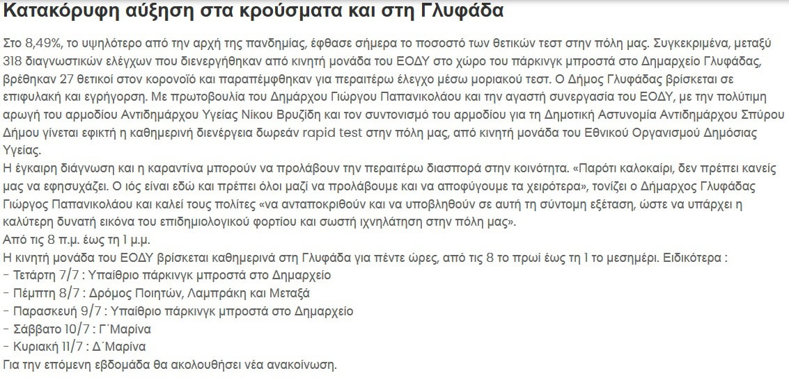 Η ανακοίνωση του Δήμου Γλυφάδας:
