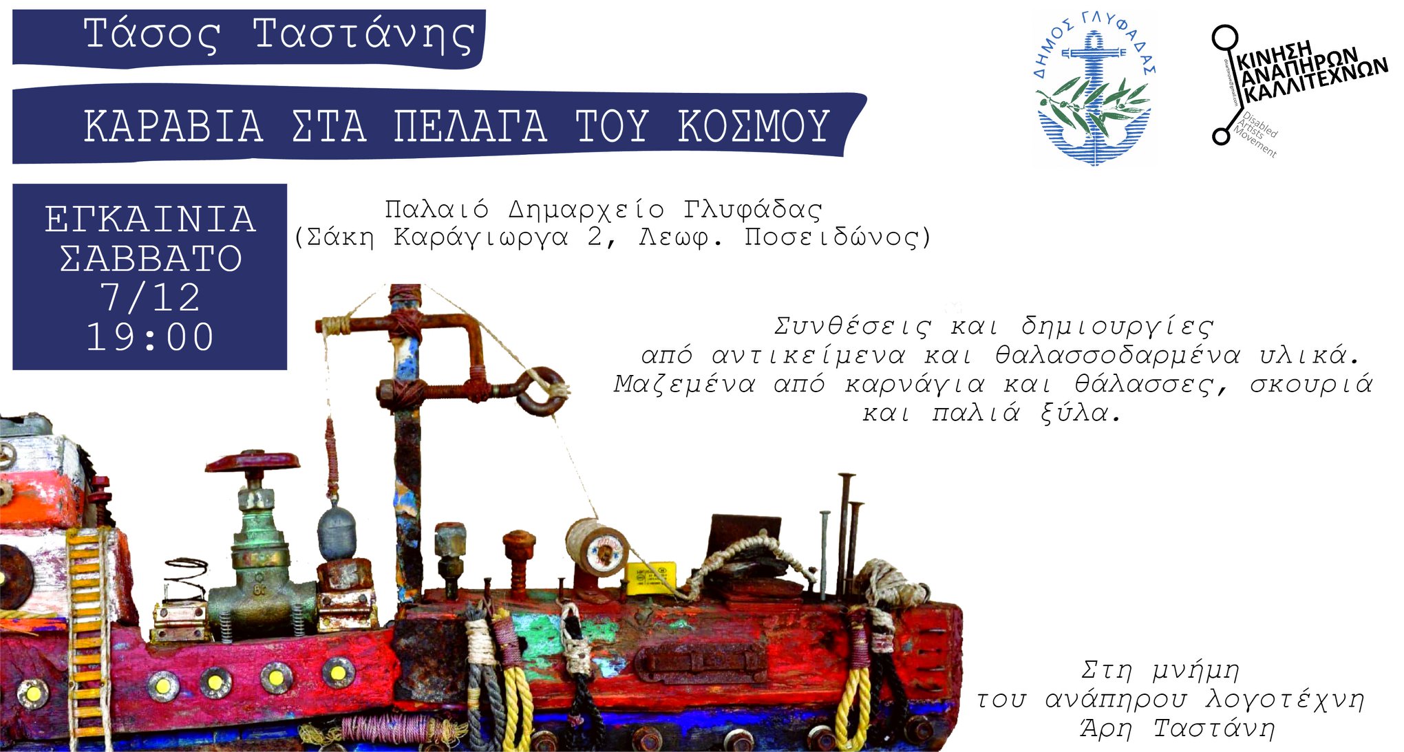 «Καράβια στα πέλαγα του κόσμου» είναι ο τίτλος της ατομικής εικαστικής έκθεσης του Αρχιτέκτονα Τάσου Ταστάνη, Δημοτικού Συμβούλου Γλυφάδας, που διοργανώνεται από την Κίνηση Αναπήρων Καλλιτεχνών, και τον Δήμο Γλυφάδας, αφιερωμένη στη μνήμη του διακεκριμένου Ελληνα λογοτέχνη και πρωτοπόρου αγωνιστή του αναπηρικού κινήματος Άρη Ταστάνη, με την ευκαιρία της συμπλήρωσης πέντε χρόνων από το θάνατο του.