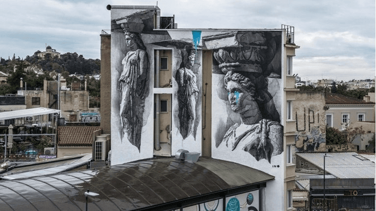 Με την υποστήριξη του δήμου Αθηνών, ο Έλληνας καλλιτέχνης ΙΝΟ δημιούργησε μια τοιχογραφία μεγάλης κλίμακας στο Μοναστηράκι, σε κτίριο επί της οδού Ερμού 121. Το έργο απεικονίζει τρεις ασπρόμαυρες Καρυάτιδες που κλαίνε.