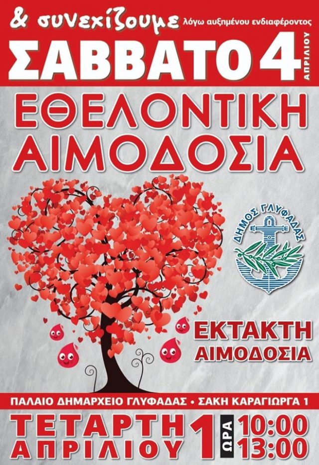“Εξήντα συμπολίτες μας θα λάβουν μέρος στην εθελοντική αιμοδοσία που θα γίνει αύριο, Τετάρτη, και προχωράμε με πολλούς ακόμα συμπολίτες μας αυτό το Σάββατο, 4 Απριλίου, το πρωί, στο παλιό Δημαρχείο. Όσοι επιθυμείτε να συμμετέχετε, επικοινωνήστε με το πενταψήφιο του Δήμου Γλυφάδας 15464 για να κλείσετε ραντεβού το Σάββατο σε συγκεκριμένη ώρα, για να μην υπάρξει συνωστισμός και αναμονές.