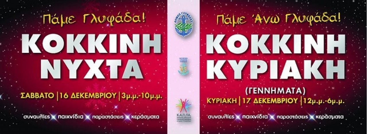 Η «Κόκκινη Νύχτα» επιστρέφει στη Γλυφάδα! Μια μεγάλη, χριστουγεννιάτικη, γιορτή, που διοργανώνεται για τρίτη συνεχόμενη χρονιά – κι αυτήν τη φορά θα είναι διπλή. Η κοινή πρωτοβουλία του Δήμου Γλυφάδας και του Εμπορικού Συλλόγου Γλυφάδας θα πραγματοποιηθεί το Σάββατο, 16 Δεκεμβρίου, στο ξεκίνημα της εορταστικής περιόδου, από τις 3 το μεσημέρι μέχρι και τις 10 το βράδυ, ενώ τα εμπορικά καταστήματα θα είναι ανοιχτά έως και τις 8 το βράδυ. Την επομένη ακριβώς, δηλαδή, την Κυριακή, 17 Δεκεμβρίου, θα πραγματοποιηθεί στην Άνω Γλυφάδα (Τερψιθέα – Αγ. Τρύφωνας) η «Κόκκινη Κυριακή», από τις 12 το μεσημέρι μέχρι και τις 6 το απόγευμα.
