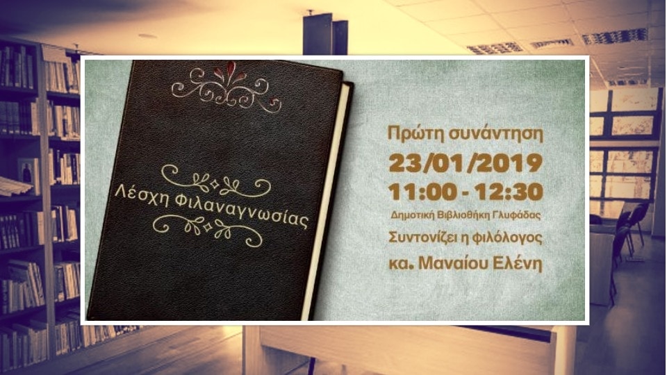 H Δημοτική Βιβλιοθήκη Γλυφάδας συνεχίζει να εμπλουτίζει και να διευρύνει το πρόγραμμά της. Από αυτή την Τετάρτη, 23 Ιανουαρίου και κάθε τελευταία Τετάρτη του μήνα, από τις 11 π.μ. έως τις 12:30 μ.μ., θα λειτουργήσει στον χώρο της Λέσχη Φιλαναγνωσίας για ενηλίκους.