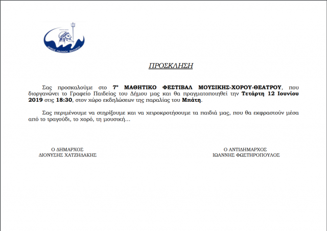 Ο Δήμαρχος Παλαιού Φαλήρου, κ. Διονύσης Χατζηδάκης, ο Αντιδήμαρχος Παιδείας, Κοιν. Αρωγής & Αθλητισμού, κ. Ιωάννης Φωστηρόπουλος, και το Γραφείο Παιδείας σας προσκαλούν στο Μαθητικό Φεστιβάλ μουσικής-χορού-θεάτρου το οποίο θα πραγματοποιηθεί την Τετάρτη 12 Ιουνίου 2019 από 18:30 έως 21:30