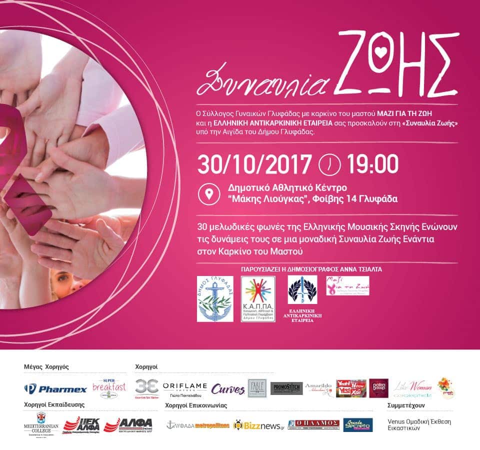 Τη Δευτέρα 30 Οκτωβρίου 2017 στις 19:00, καταξιωμένες μελωδικές φωνές της Ελληνικής Μουσικής Σκηνής, ενώνουν τις δυνάμεις τους σε μια Συναυλία Ζωής στο Δημοτικό Αθλητικό Κέντρο Μάκης Λιούγκας, υπό την Αιγίδα του Δήμου Γλυφάδας, με σκοπό την ευαισθητοποίηση δημοτών και ιδιωτικών φορέων ώστε, η πόλη μας να αποκτήσει δικό της Υπερηχογράφο Μαστού.