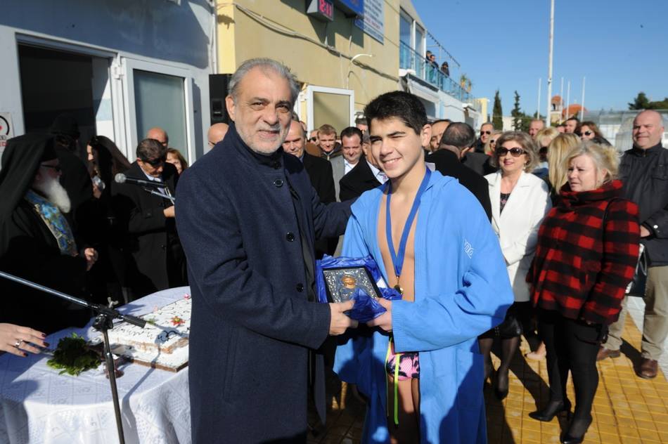 Το Σταυρό στα νερά έριξε ο πατέρας Ευθύμιος από τον Ι.Ν. Αγίων Αναργύρων.