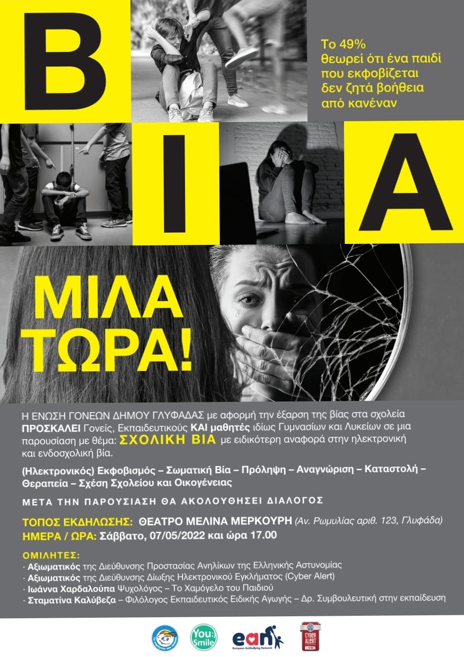 Σύμφωνα με τα στοιχεία έρευνας, ένας στους δύο πολίτες θεωρεί ότι ένα παιδί το οποίο εκφοβίζεται δεν ζητά βοήθεια από κανέναν ! Γι αυτό και είναι πολύ σημαντική η παρουσία στην εκδήλωση αυτή, των μαθητών. Πρέπει να ακούσουν, να ενημερωθούν, να μιλήσουν.