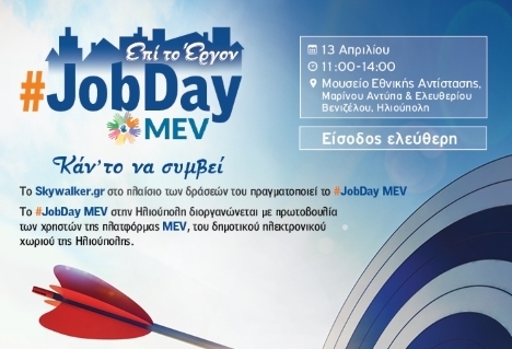 Το Σάββατο 13 Απριλίου με πρωτοβουλία του MEV Ηλιούπολης και του Skywalker.gr θα υλοποιηθεί η δράση #JobDay MEV, για όσους δημότες της Ηλιούπολης και όχι μόνο, είναι άνεργοι και προσπαθούν να αναζητήσουν εργασία αλλά και για όσους ενδιαφέρονται να βρουν τρόπους προσέγγισης νέας εργασίας ή νέων ιδεών.