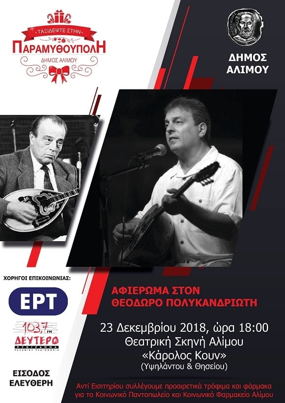 Ο Δήμος Αλίμου στο πλαίσιο των Χριστουγεννιάτικων εκδηλώσεων της «Παραμυθούπολής» του, διοργανώνει ένα μουσικό αφιέρωμα στον μεγάλο τραγουδοποιό Θεόδωρο Πολυκανδριώτη.