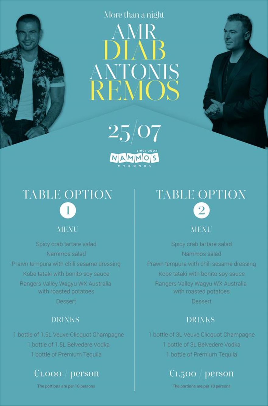 Λίγο μετά τα μεσάνυχτα, ο Αντώνης Ρέμος και ο Αμρ Ντιαμπ εμφανίζονται στο καθιερωμένο συναυλιακό event του καλοκαιριού στο Nammos, με κόστος από 1.000 έως 1.500 ευρώ το άτομο.
