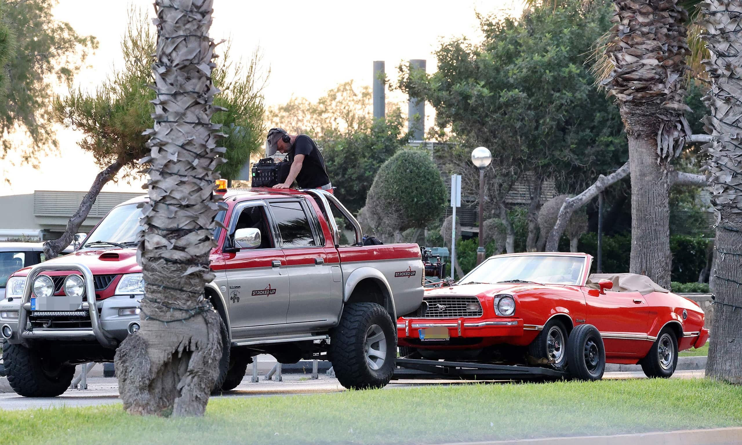 Κρατώντας το τιμόνι μιας Mustang αντίκα και ακούγοντας τις σκηνοθετικές οδηγίες, ο Κωνσταντίνος Αργυρός τράβηξε σχετικά εύκολα πάνω του το ενδιαφέρον του κόσμου που εκείνη την ώρα βρισκόταν στην περιοχή.