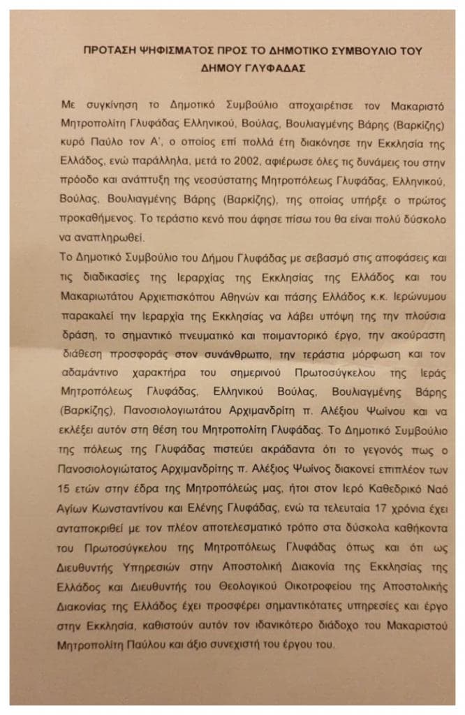 Το Δημοτικό Συμβούλιο Γλυφάδας με σεβασμό στις αποφάσεις και στις διαδικασίες της Ιεραρχίας της Εκκλησίας της Ελλάδος και του Μακαριωτάτου Αρχιεπισκόπου Αθηνών και πάσης Ελλάδος κ.κ. Ιερώνυμου παρακαλεί την Ιεραρχία της Εκκλησίας να λάβει υπόψη της, την πλούσια δράση, το σημαντικό πνευματικό και ποιμαντορικό έργο, την ακούραστη διάθεση προσφοράς στον συνάνθρωπο, την τεράστια μόρφωση και τον αδαμάντινο χαρακτήρα του σημερινού Πρωτοσύγκελου της Ιεράς Μητρόπολης Γλυφάδας, Ελληνικού, Βούλας, Βουλιαγμένης, Βάρης (Βαρκίζης), Πανοσιολογιωτάτου Αρχιμανδρίτη π.Αλέξιου Ψωίνου και να εκλέξει αυτόν στη θέση του Μητροπολίτη.