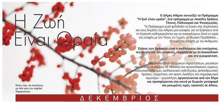 Το Πρόγραμμα αυτό φιλοδοξεί να δώσει στις δημότισσες και τους δημότες του Αλίμου μια ευκαιρία, για να ξεφύγουν από τη δύσκολη καθημερινότητα και να ανακαλύψουν ξανά τη χαρά της επαφής με την Τέχνη, τη Γνώση, το Φυσικό Περιβάλλον… τη χαρά της επαφής με τον Άνθρωπο.