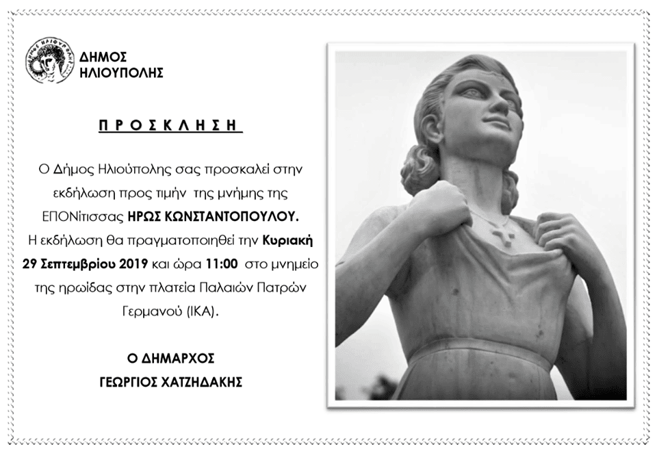 Την Κυριακή 29 Σεπτεμβρίου 2019, ώρα 11.00 πμ στο άγαλμα της, στην πλατεία Παλαιών Πατρών Γερμανού (ΙΚΑ).