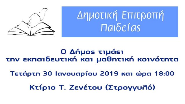 Με την ευκαιρία του εορτασμού της μνήμης των Τριών Ιεραρχών, η Δημοτική Επιτροπή Παιδείας Αγίου Δημητρίου διοργανώνει εκδήλωση προς τιμήν της εκπαιδευτικής και μαθητικής κοινότητας της πόλης μας, την Τετάρτη 30 Ιανουαρίου 2019 και ώρα 18:00, στο Αμφιθέατρο του 1ου Γυμνασίου – 1ου Λυκείου Αγ. Δημητρίου (Παπάγου & Καλλιθέας).