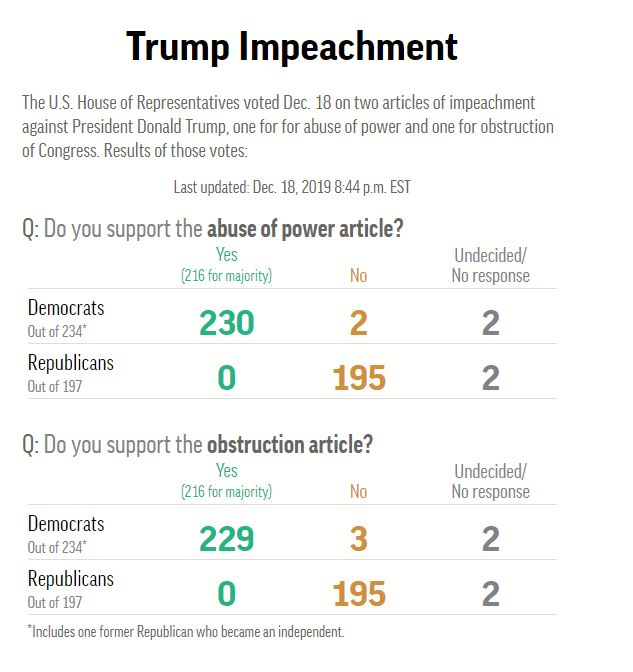 Όπως αναμενόταν, η Βουλή, στην οποία την πλειοψηφία έχει το κόμμα των Δημοκρατικών, ανήγγειλε την έγκριση της απαγγελίας κατηγοριών στον Τραμπ για το τηλεφώνημα στον Ουκρανό πρόεδρο Ζελένσκι, τον οποίο φέρεται να πίεσε για να γίνει έρευνα σε βάρος του Τζο Μπάιντεν και του γιου του. Στο άρθρο 1 (κατάχρηση εξουσίας) όλα τα μέλη των Ρεπουμπλικανών ψήφισαν κατά, ενώ από πλευράς Δημοκρατικών 230 ήταν τα «ναι», δύο είπαν «όχι», ενώ μία βουλευτής ψήφισε «παρών». «Ναι» ψήφισε και ένας ανεξάρτητος βουλευτής.