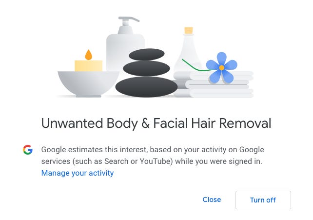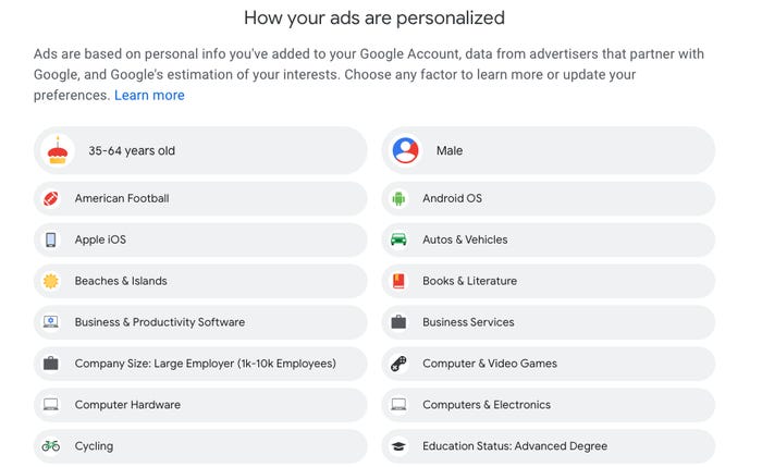 Κάποια άλλα στοιχεία πάντως που συγκεντρώνει η Google και κάνει προβλέψεις προκειμένου να πλασάρει διαφημίσεις είναι αστεία. Ενδεικτικό είναι το παράδειγμα ότι ο χρήστης πριν από λίγο καιρό έψαχνε για ξυραφάκι, προκειμένου να ξυρίσει τα γένια του και τελικά διαπίστωσε πως η Google τον είχε κατατάξει σε ομάδα που ενδιαφέρεται για «ανεπιθύμητη αποτρίχωση σώματος και προσώπου».