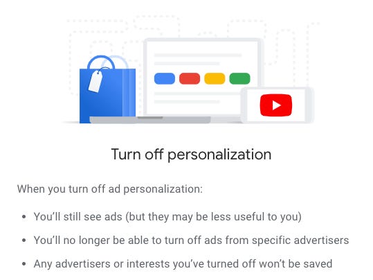 Όταν λοιπόν επιλέξετε να απενεργοποιήσετε την εξατομίκευση διαφημίσεων, θα δείτε αυτό το μήνυμα που σας υπενθυμίζει ότι οι διαφημίσεις θα εξακολουθούν να εμφανίζονται, αλλά θα είναι λιγότερο στοχευμένες σε εσάς.