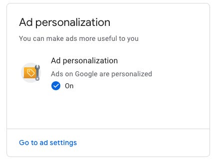Το προφίλ που έχει δημιουργήσει η Google βάσει του ιστορικού σας μπορείτε να το εντοπίσετε στην ενότητα Εξατομίκευση διαφημίσεων (Ad personalization). Κάντε κλικ στο Μετάβαση στις ρυθμίσεις διαφήμισης (Go to ad settings) για να δείτε το πλήρες προφίλ που έχει δημιουργηθεί για εσάς.