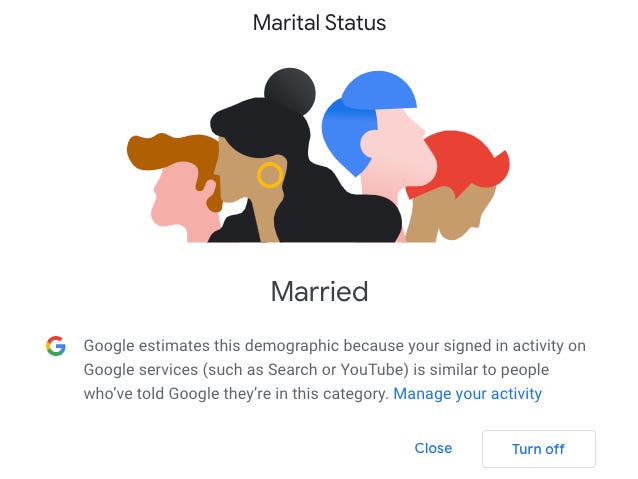Πολλοί πιστεύουν πως η Google κρατάει κρυφά από τους χρήστες τα στοιχεία που έχει αντλήσει γι αυτούς. Ωστόσο κάτι τέτοιο δεν ισχύει γιατί κάνοντας κλικ σε ένα link στη σελίδα ρυθμίσεων ενός λογαριασμού Google, οι χρήστες μπορούν να δουν όσα γνωρίζει η Google γι ‘αυτούς. Ξεκινάει από τα πιο απλά όπως ηλικία, φύλο, οικογενειακή κατάσταση, ενδιαφέροντα, ακόμα και… το εισόδημα.