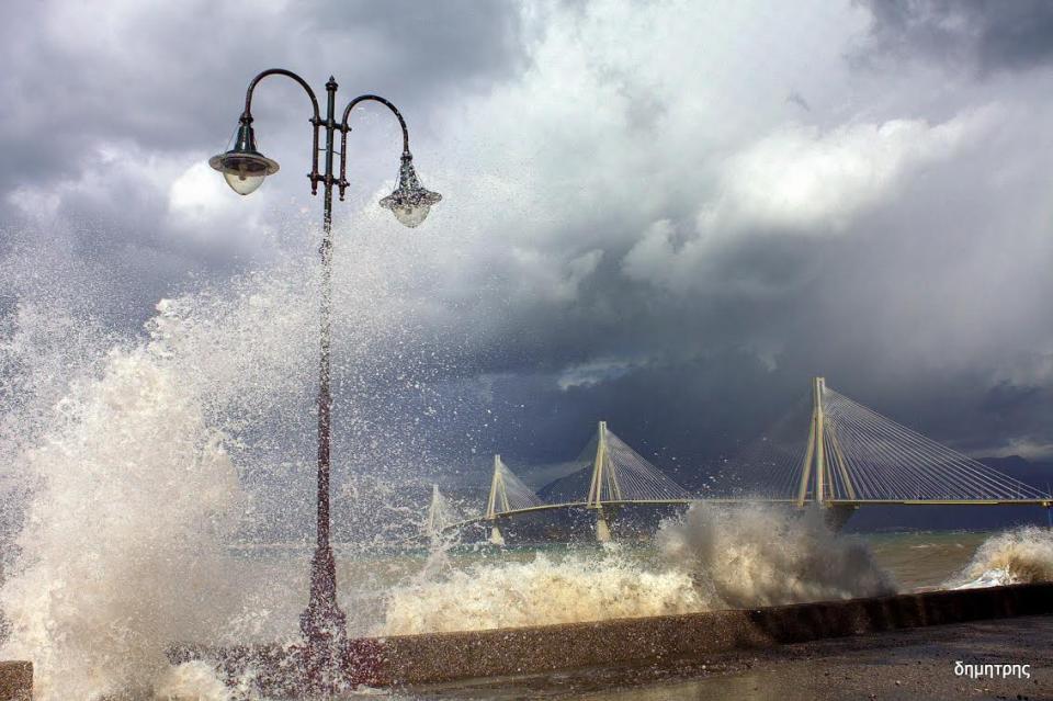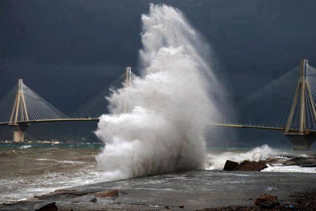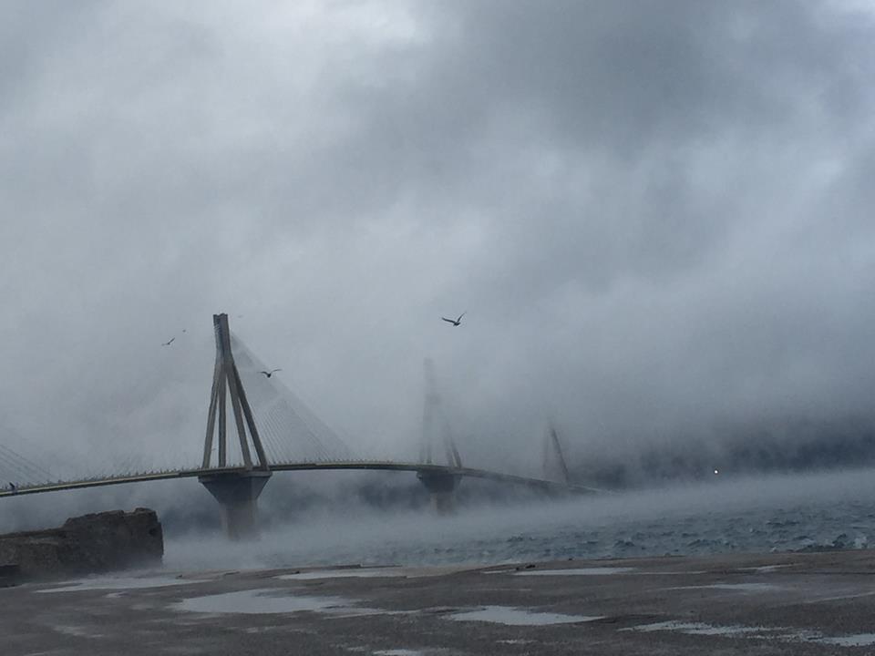 Η κακοκαιρία πλήττει συχνά πυκνά την Δυτική Ελλάδα και πολλές φορές η γέφυρα Ρίου-Αντιρρίου χάνεται μέσα στην πυκνή χιονόπτωση και την ομίχλη ή αγέρωχα παλεύει με τον άνεμο και τα κύματα του πατραϊκού κόλου.