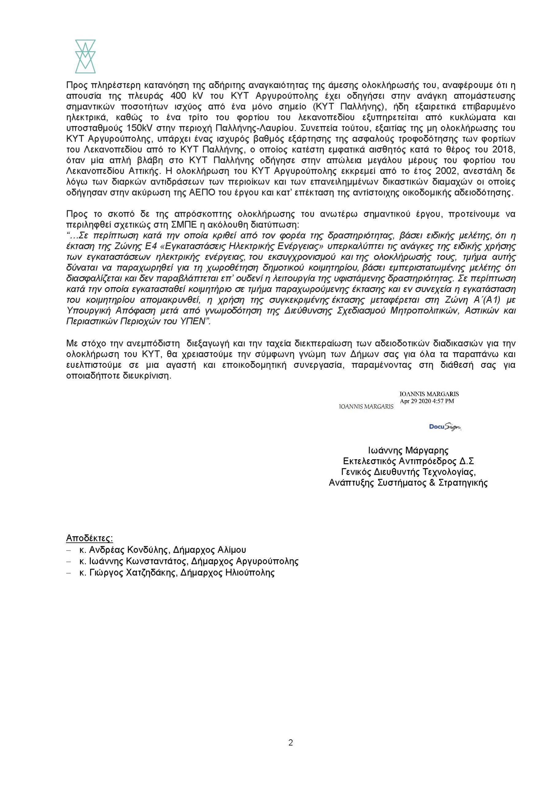 1. Το δημοτικό συμβούλιο όχι μόνο δεν πρόκειται να δεχθεί καμία επέκταση του Κ.Υ.Τ στα 400K.V. αλλά θα ζητήσει και την άμεση απομάκρυνσή του.