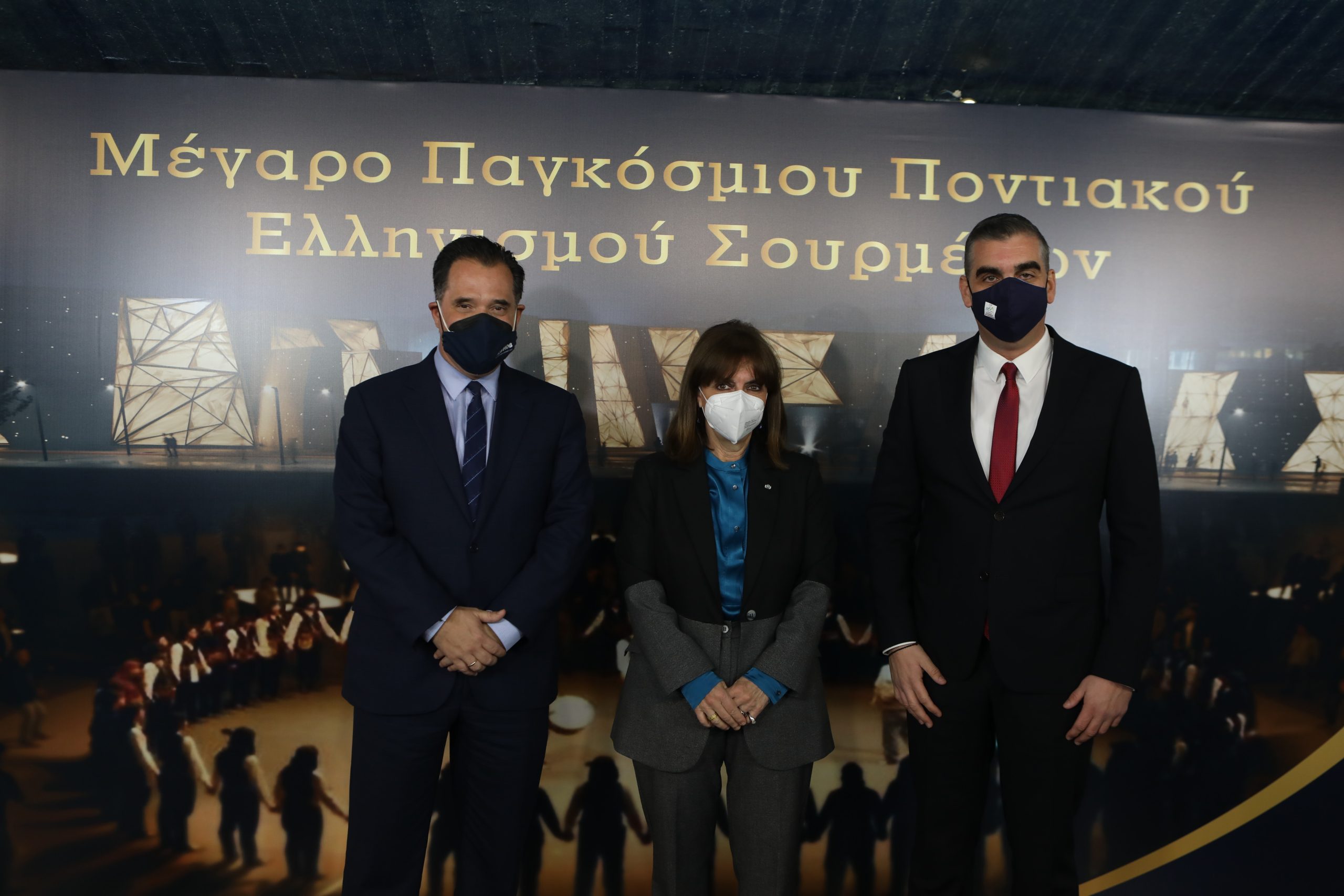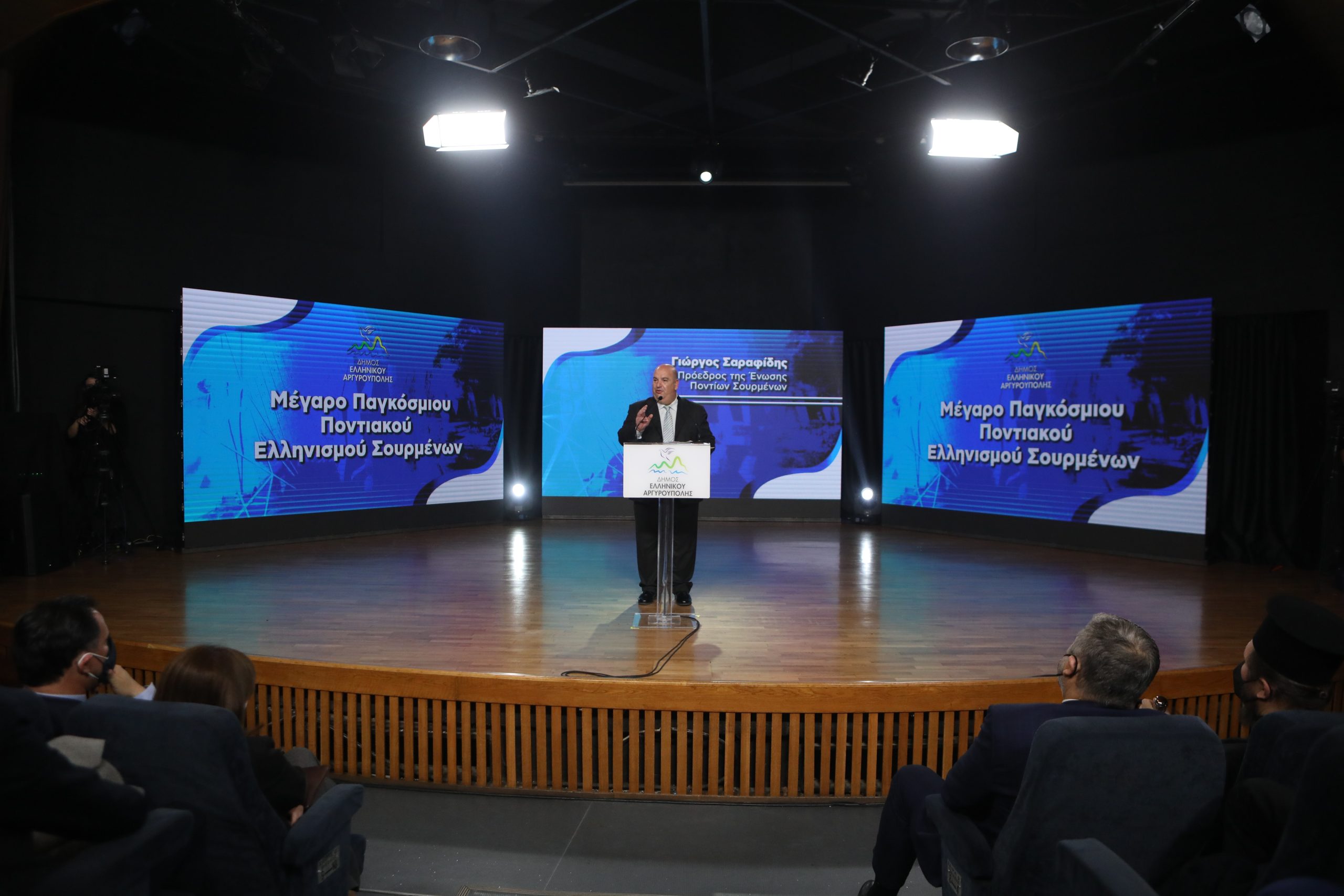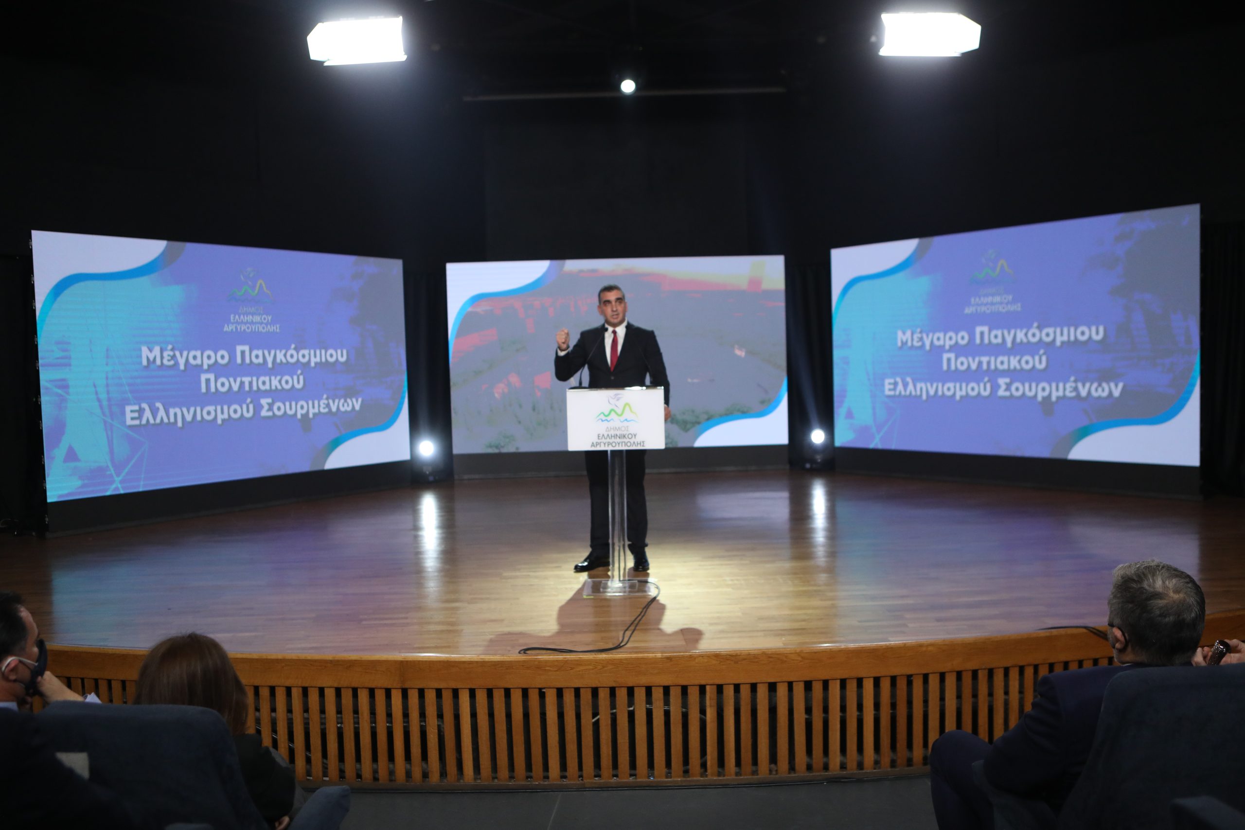 ‘’Σήμερα 100 χρόνια από την καταστροφή της Σμύρνης και 100 χρόνια από την παρουσία των πρώτων προσφύγων στα Σούρμενα παρουσία της Α.Ε. Προέδρου της Δημοκρατίας, της Πολιτικής Ηγεσίας, πλήθος Υπουργών, Βουλευτών και Δημάρχων καθώς και εκπροσώπων όλων των ποντιακών Σωματείων απ’ όλο τον κοσμο που μας έβλεπαν ζωντανά, γεννήθηκε το Μέγαρο Παγκοσμίου Ποντιακού Ελληνισμού Σουρμένων, ένα κτήριο ορόσημο – ένα όνειρό μας – μια διεκδίκησή μας στο χώρο του παλαιού αεροδρομίου, που συμβολίζει τη ζωή και την αναγέννηση του πόντου που έχει ως απεικόνιση την Παναγία Σουμελά, τον Πυρρίχιο χορό, τον Ευξ. Πόντο και στο κέντρο το κενό συμβολίζει τις ζωές που χάθηκαν αλλά δεν ξεχάστηκαν. Συνεχίζουμε την μακρά παράδοση δημιουργίας των 30 αιώνων πολιτισμού του Πόντου’’