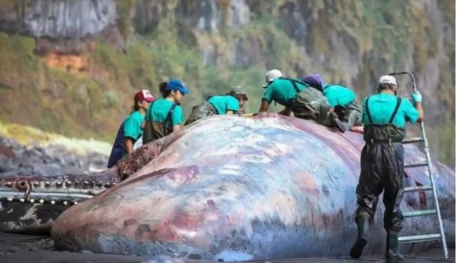 Με ένα πρωτόγνωρο θέαμα βρέθηκε αντιμέτωπη ομάδα ερευνητών στο νησί Λα Πάλμα των Κανάριων νήσων, όταν μια φάλαινα ξεβράστηκε νεκρή σε παραλία.