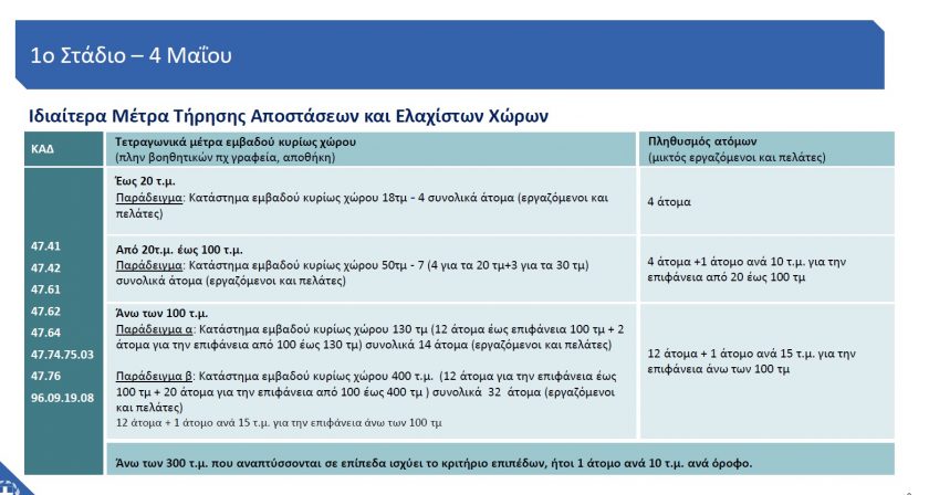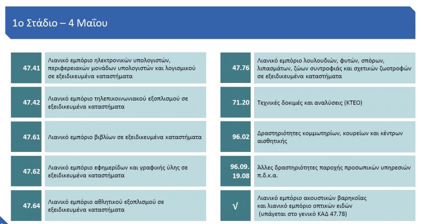 Οι Κωδικοί Αριθμοί Δραστηριότητας (ΚΑΔ) των επιχειρήσεων που θα επαναλειτουργήσουν στις 4 Μαΐου είναι οι εξής:
