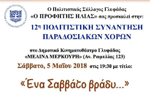 Ο Πολιτιστικός Σύλλογος Γλυφάδας «Ο Προφήτης Ηλίας» προσκαλεί το κοινό στην 12η πολιτιστική συνάντηση παραδοσιακών χορών, η οποία θα πραγματοποιηθεί στο Δημοτικό Κινηματοθέατρο «Μελίνα Μερκούρη» (Αν. Ρωμυλίας 123), στην Άνω Γλυφάδα, το Σάββατο, 5 Μαΐου, στις 19:30, με τίτλο: «Ένα Σάββατο βράδυ…».