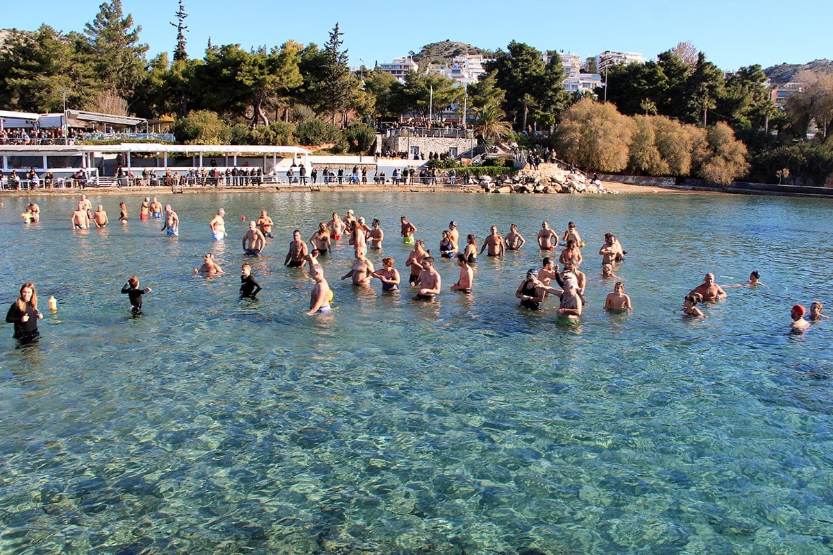 Ακολούθησε η αντίστοιχη τελετή στη Βουλιαγμένη και στις εγκαταστάσεις του Ναυτικού Ομίλου Κατοίκων Βουλιαγμένης, που πλημμύρισε από κόσμο. Οι τακτικοί χειμερινοί κολυμβητές της πλαζ, Βουλιαγμενιώτες μικροί και μεγάλοι βούτηξαν στο νερό, όμως το σταυρό πήρε ο πιο τυχερός, αφού η πολυκοσμία στον μώλο δεν επέτρεψε στον ιερέα να πλησιάσει στην άκρη και έτσι επέλεξε να τον πετάξει από μακριά στους συγκεντρωμένους.