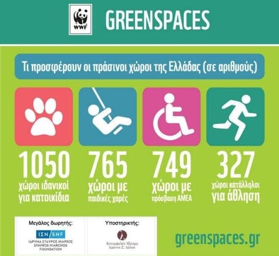 Από τον Απρίλιο του 2016, όταν το WWF Ελλάς δημιούργησε την πρωτοποριακή και δωρεάν εφαρμογή για κινητά «WWF GreenSpaces», που δίνει τη δυνατότητα σε όλους να ανακαλύψουν τους χώρους αστικού πρασίνου και να τους αξιολογήσουν, περισσότεροι από 8.500 πολίτες έχουν ήδη καταγράψει και βαθμολογήσει πάνω από 1.700 χώρους πρασίνου σε 126 ελληνικές πόλεις. Η εφαρμογή δημιουργήθηκε στο πλαίσιο του προγράμματος WWF Καλύτερη Ζωή, για τη βελτίωση της καθημερινότητας των πολιτών, μεγάλος δωρητής του οποίου είναι το Ίδρυμα Σταύρος Νιάρχος και υποστηρικτής το Κοινωφελές Ίδρυμα Ιωάννη Σ. Λάτση.