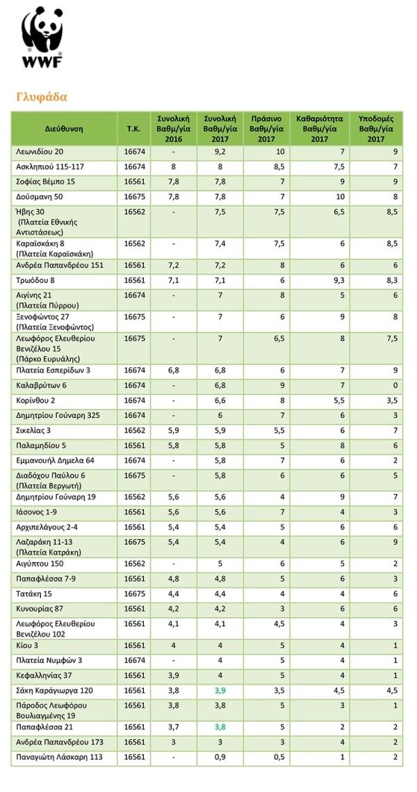 Μέσα από την καινοτόμο εφαρμογή WWF GreenSpaces, 9.000 πολίτες έχουν αξιολογήσει μέχρι στιγμής 1.700 χώρους πρασίνου σε 126 ελληνικές πόλεις. Πώς βαθμολογούν λοιπόν οι Έλληνες το πράσινο της πόλης τους και τι προκύπτει από τα αποτελέσματα της αξιολόγησης που δημοσιεύονται για δεύτερη συνεχόμενη χρονιά από το WWF Ελλάς; Φαίνεται πως έχουμε ακόμη πολύ δρόμο, καθώς ο μέσος όρος βαθμολογίας ίσα που ξεπερνάει τη βάση, αγγίζοντας το 6,1 με άριστα το 10. Στη Γλυφάδα τις υψηλότερες βαθμολογίες- όπως θα δείτε στον πίνακα- συγκεντρώνουν οι δρόμοι Λεωνιδίου (10), Ασκληπιού (8,5), Ήβης- πλατεία Εθνικής Αντιστάσεως (7,5) Σοφία Βέμπο (7), Δούσμανη (7) και τις χαμηλότερες Παναγιώτη Λάσκαρη (0,5), Ανδρέα Παπανδρέου (3), Σάκη Καράγιωργα (3,5) κ.α. Βέβαια η βελτιωμένη εικόνα της πόλης οφείλεται και στις εκτεταμένες δεντροφυτεύσεις που προχώρησε το τελευταίο χρονικό διάστημα ο δήμος Γλυφάδας.