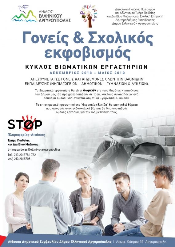 Ο δήμος Ελληνικού – Αργυρούπολης, η Διεύθυνση Παιδείας Πολιτισμού και Αθλητισμού δια του Τμήματος Παιδείας και Δια Βίου Μάθησης στοχεύοντας στην ευαισθητοποίηση των γονέων στο θέμα του σχολικού εκφοβισμού και την ενίσχυση των οικογενειών στα θέματα διαχείρισης ενδοσχολικής βίας υλοποιεί κύκλο βιωματικών εργαστηρίων με τον τίτλο «Γονείς και Σχολικός εκφοβισμός» σε συνεργασία με την «Θεραπεία = Ελπίδα» και την Διεπιστημονική της ομάδα.