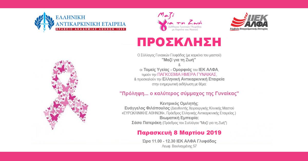 Ο Σύλλογος Γυναικών Γλυφάδας με καρκίνο του μαστού “ΜΑΖΙ ΓΙΑ ΤΗΝ ΖΩΗ” και οι Τομείς Υγείας – Ομορφιάς του ΙΕΚ ΑΛΦΑ τιμούν την ΠΑΓΚΟΣΜΙΑ ΗΜΕΡΑ ΓΥΝΑΙΚΑΣ