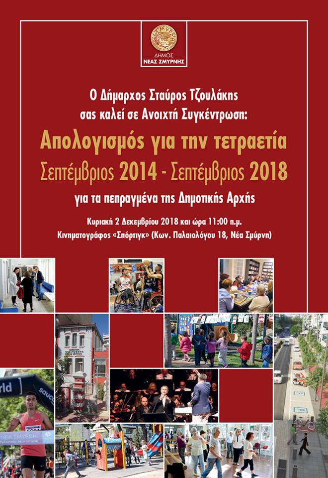 Σας προσκαλούμε στην παρουσίαση του απολογισμού πεπραγμένων των ετών 2014-2018, την Κυριακή 2 Δεκεμβρίου, στις 11πμ,στον Κινηματογράφο “Σπόρτιγκ” (Κων/νου Παλαιολόγου 18, Νέα Σμύρνη).