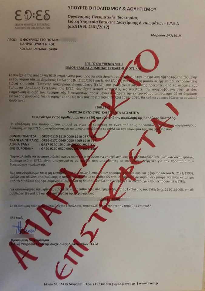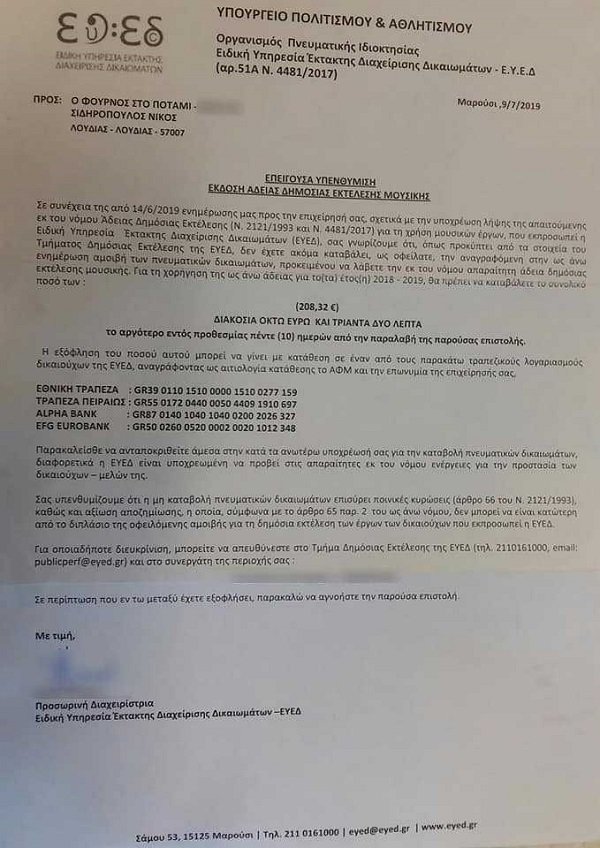 Από την σφραγίδα και με την βοήθεια του google διαπίστωσα ότι η ΕΥΕΔ είναι η καινούργια ΑΕΠΙ και είναι επιφορτισμένη με την είσπραξη πνευματικών δικαιωμάτων. Την Τετάρτη 17 Ιούλη ο ταχυδρόμος μου έφερε την «λυπητερή»:208,32€ για Άδεια Δημοσίας Εκτέλεσης.