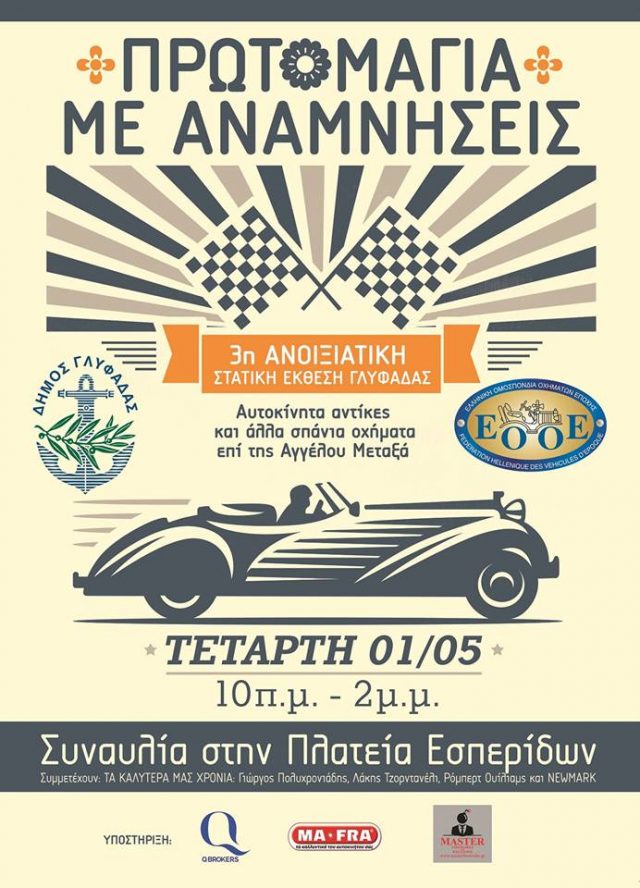 Συγκεκριμένα, την ερχόμενη Τετάρτη, 1η Μαΐου, ο Δήμος Γλυφάδας, η Ελληνική Ομοσπονδία Οχημάτων Εποχής (Ε.Ο.Ο.Ε) και τα σωματεία-μέλη της σας καλούν να γιορτάσουμε την Πρωτομαγιά του 2019 με την «3η Ανοιξιάτικη Στατική Έκθεση Γλυφάδας», από τις 10 το πρωί έως τις 2 το μεσημέρι, με δεκάδες αυτοκίνητα αντίκες και άλλα σπάνια οχήματα.