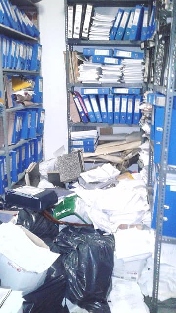 Έγγραφα και φάκελοι στο πάτωμα και σε σακκούλες σκουπιδιών στη μία φωτογραφία και στην άλλη τα έγγραφα όπως τακτοποιήθηκαν στα ράφια και ψηφιοποιήθηκαν.